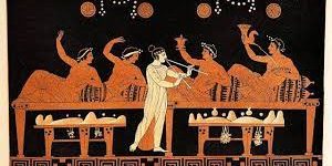 Nella Grecia arcaica il banchetto era un momento di allegria e di culto della memoria collettiva: i commensali maschi, seduti nel megaron (la sala più lussuosa) davanti a una piccola tavola, mangiavano carne e bevevano vino ascoltando l’aedo.